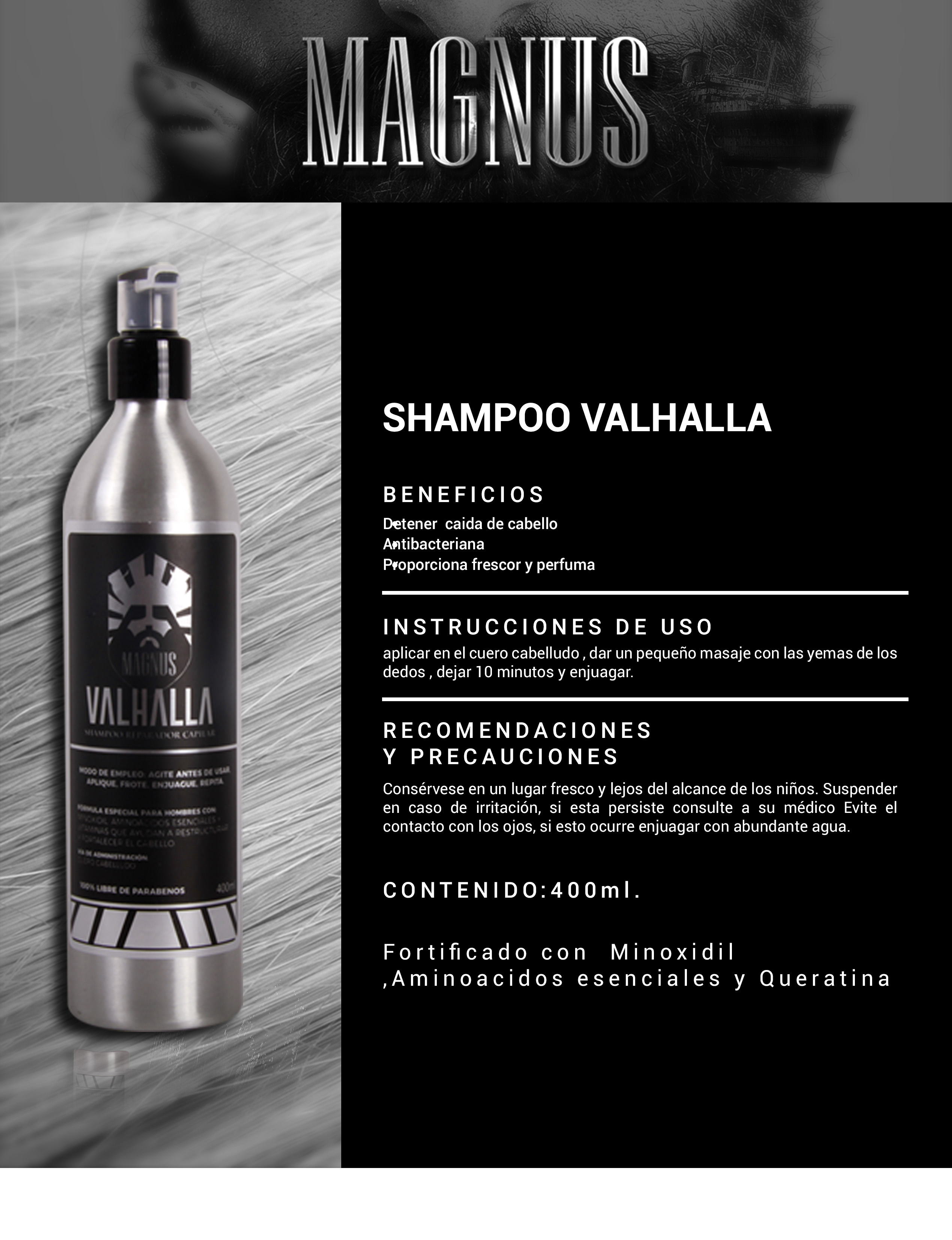 Dile adiós a la caída Tratamiento de nuestra formula única y mejorada para evitar la caída del cabello y aumentar el grosor del pelo, perfecto para personas que empiezan a usar el tratamiento o que empiezan a notar caída en su cuero cabelludo, se presenta en formato de 400ml, de fácil dosificación por medio shampoo. La molécula de minoxidil tiene una función clínicamente comprobada que funciona para detener la caída de cabello, el vehículo de nuestra solución viene enriquecido con activos que permiten una mayor penetración en la piel, haciendo que Magnus funcione de manera más rápida y efectiva.
